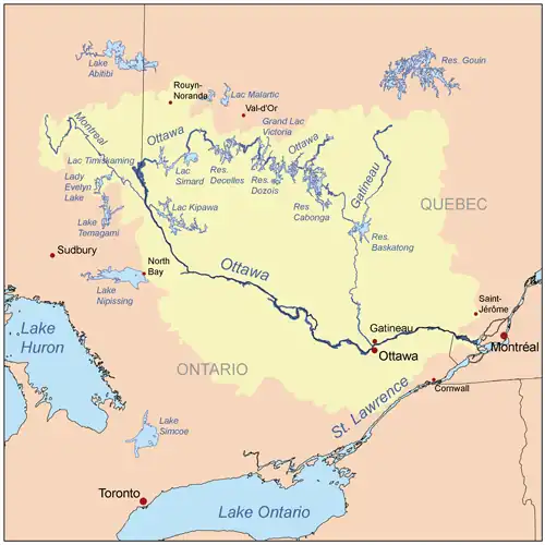 The river rises at Lac des Outaouais, north of the Laurentian Mountains of central Quebec, and flows west to Lake Timiskaming. From there its route has been used to define the interprovincial border with Ontario.