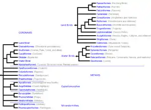 Cladogram showing the most recent classification of Neoaves, based on several phylogenetic studies