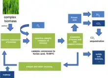 Formic acid is obtained by aqueous catalytic partial oxidation of wet biomass.[1][2][3] A Keggin-type polyoxometalate (H5PV2Mo10O40) is used as the homogeneous catalyst to convert sugars, wood, waste paper or cyanobacteria to formic acid and CO2 as the sole byproduct. Yields of up to 53% formic acid can be achieved.