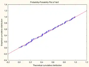 In statistics, a P–P plot (probability–probability plot or percent–percent plot or P value plot) is a probability plot for assessing how closely two data sets agree, or for assessing how closely a dataset fits a particular model. It works by plotting the two cumulative distribution functions against each other; if they are similar, the data will appear to be nearly a straight line. This behavior is similar to that of the more widely used Q–Q plot, with which it is often confused.