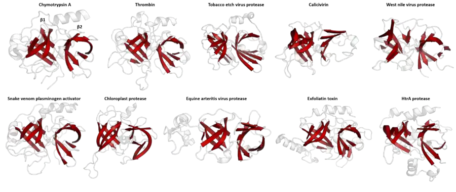 ![]() The double β-barrels that characterise the PA clan are highlighted in red. (TEV protease, PDB: 1lvm) | |