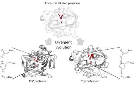 The common use of the catalytic triad for hydrolysis by multiple clans of proteases, including the PA clan, represents an example of convergent evolution.[7] The differences in the catalytic triad within the PA clan is also an example of divergent evolution of active sites in enzymes.[2]