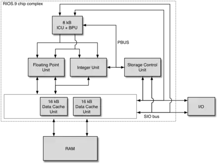 The POWER1 is a multi-chip CPU built from separate chips that are connected to each other by buses. The POWER1 consists of an instruction-cache unit (ICU), a fixed-point unit (FXU), a floating point unit (FPU), a number of data-cache units (DCU), a storage-control unit (SCU) and an I/O unit. Due to its modular design, IBM was able to create two configurations by simply varying the number of DCUs, RIOS-1 and a RIOS.9. The RIOS-1 configuration has four DCUs, the intended amount, and was clocked at up to 40 MHz, whereas the RIOS.9 CPU had two DCUs and was clocked at lower frequencies.
