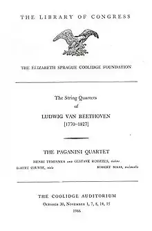 The Paganini Quartet was an American string quartet founded by cellist Robert Maas and violinist Henri Temianka in 1946.[1][2] The quartet drew its name from the fact that all four of its instruments, made by Antonio Stradivari (1644–1737), had once been owned by the great Italian violinist and composer Niccolo Paganini (1782–1840).