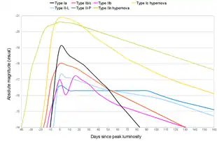 In contrast to the spectra, the light curves are quite different from the common types of supernova. The light curves are highly extended, with peak luminosity occurring months after onset.[8] This is due to the extreme amounts of 56Ni expelled, and the optically dense ejecta, as the star is entirely disrupted.