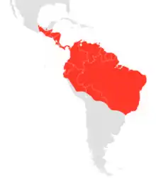 The species ranges from southern Mexico to northern Peru, Bolivia, and Paraguay, and across to southeastern Brazil.[2] Reports of its occurrence in northernmost Argentina are controversial, being based on only a single specimen, which was subsequently lost. It inhabits lowland forests and agricultural areas, at elevations up to 610 metres (2,000 ft).[3] Two subspecies are currently recognised, although whether or not they are genuinely distinct has been questioned:[5]