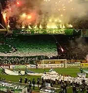 The main organized supporters of Panathinaikos are known as Gate 13 (est. 1966), which consists of around 80 clubs alongside Greece and Cyprus.[31] Gate 13 style of supporting includes the use of green fireworks, large and small green flags, displaying of banners and especially the creation of colourful and large choreographies, noisy and constant cheering and other supporters stuff. Gate 13 has over the years become a part of the club by affecting club decisions and by following the club on all occasions. PALEFIP (Panhellenic club of Panathinaikos friends) is the other major supporters organization.[32] Panathinaikos F.C. currently is the only supporter-owned football club in Greece.