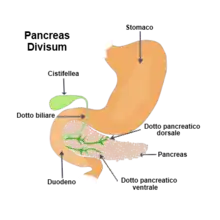 Pancreatic divisum is a congenital anomaly in the anatomy of the ducts of the pancreas in which a single pancreatic duct is not formed, but rather remains as two distinct dorsal and ventral ducts. Most individuals with pancreas divisum remain without symptoms or complications. A minority of people with pancreatic divisum may develop episodes of abdominal pain, nausea or vomiting due to acute or chronic pancreatitis. The presence of pancreas divisum is usually identified with cross sectional diagnostic imaging, such as endoscopic retrograde cholangiopancreatography (ERCP) or magnetic resonance cholangiopancreatography (MRCP). In some cases, it may be detected intraoperatively.[1] If no symptoms or complications are present, then treatment is not necessary. However, if there is recurrent pancreatitis, then a sphincterotomy of the minor papilla may be indicated.