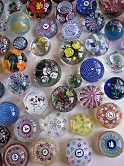 A paperweight is a small solid object heavy enough, when placed on top of papers, to keep them from blowing away in a breeze or from moving under the strokes of a painting brush (as with Chinese calligraphy). While any object, such as a stone, can serve as a paperweight, decorative paperweights of glass are also produced, either by individual artisans or factories. The decorative paperweights are usually in limited editions, and are collected as works of fine glass art, some of which are exhibited in museums.[1][2] First produced in about 1845, particularly in France, such decorative paperweights declined in popularity before undergoing a revival in the mid-twentieth century.