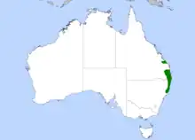 The paradise riflebird is endemic to eastern Australia, from New South Wales to Queensland, where it inhabits rainforests. It resides in the rainforest canopy, above 500 m (1640 ft) in elevation, though has been known to move to lower elevations, sometimes below 200 m (656 ft), in winter.[6] It is primarily a sedentary species with a low population density.[10] However, it has been known to migrate locally, moving from wet rainforests to nearby sclerophyll forests.[6]