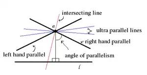 As in the illustration through a point a not on line l there are two limiting parallel lines, one for each direction ideal point of line l. They separate the lines intersecting line l and those that are ultra parallel to line l.