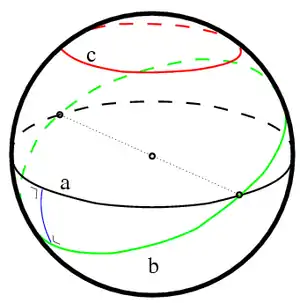 In spherical geometry, all geodesics are great circles. Great circles divide the sphere in two equal hemispheres and all great circles intersect each other. Thus, there are no parallel geodesics to a given geodesic, as all geodesics intersect. Equidistant curves on the sphere are called parallels of latitude analogous to the latitude lines on a globe. Parallels of latitude can be generated by the intersection of the sphere with a plane parallel to a plane through the center of the sphere.