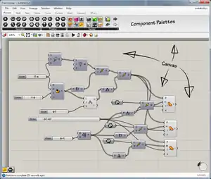 Grasshopper 3DA plug-in for Rhinoceros 3D that provides a visual programming language interface to create and edit geometry. It is based on graphs that map the flow of relations from parameters through user-defined functions (nodes).