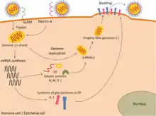 Viral replication is cytoplasmic. Entry into the host cell is achieved by viral attachment to host cell. Replication and transcription follow the negative-stranded RNA virus models.[7] Translation takes place by leaky scanning, ribosomal shunting, and RNA termination-reinitiation. The virus exits the host cell by budding. Vertebrates, including humans and birds serve as the natural hosts. Transmission route is airborne particles.[1]