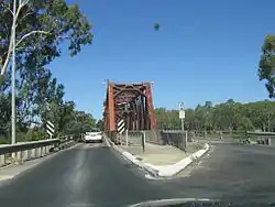 The bridge consists of a vertical-lift span 78 feet (24 m) long which can rise 30 feet (9.1 m) in one and a half minutes. There are three Pratt truss spans of 112.5 feet (34.3 m), and a plate girder span at each end.[1] It was designed by the South Australian Railways (SAR) and fabricated by Perry Engineering of Adelaide. It opened on 31 January 1927.[2][3] It was built as a road-rail bridge with both the Sturt Highway and Barmera railway lines using the same reservation.[4] Maintenance cost were shared equally between the SAR and Highways department.[5]