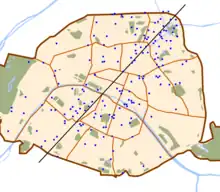 Map of central districts of Paris, showing where shells fired by the Paris Gun landed, June-August 1918, and a line indicating the direction of the German guns. (Some shells landed outside this area.) Based on Miller (1921), pg. 735