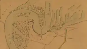 The fortress of Humaitá was situated on a level cliff about 30 feet (10 metres) above the river, on a sharp horseshoe bend.[58] The bend, called the Vuelta de Humaitá[59] was an ideal strategic pinch point. It was some 1,500 metres (4,900 ft) long; the navigable channel narrowed to only 200 metres (660 ft) broad; the current was 2.8 knots (5.2 km/h; 3.2 mph) and in places 3 knots (5.6 km/h; 3.5 mph), difficult for the ships of the day to stem; and (a matter that was to horrify the Brazilian navy[60]) ideal for the release of 'torpedoes' (nineteenth century floating naval mines).[61][62]