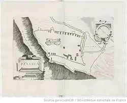 The site is not mentioned in Byzantine times until after the Frankish conquest of the Peloponnese, when Mani was given to John of Nully, who built a castle at Las sometime after 1218. This castle became known as Passavant or Passavas in Greek, a name probably related to the motto or war-cry Passe-Avant, "move forward", or to one of the similar toponyms in northeastern France.[11] Nully's Barony of Passavant comprised four knight's fiefs, but virtually nothing is known about it.[12] It was apparently short-lived, with the castle itself falling to the Byzantines during their first offensives in the Peloponnese in ca. 1263.[13]