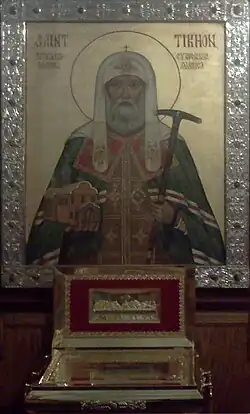 St Tikhon's relics were believed lost, but on 19 February 1992 his coffin was found in a hidden crypt in the Donskoy Monastery and on 22 February, the coffin was opened and his relics were discovered to be almost entirely incorrupt.[10] The relics were placed in a reliquary and on 5 April [O.S. 23 March] 1992, fifty bishops solemnly transferred them to the Katholikon (main church) of the Donskoy Monastery in a place of honour by the soleas (close to the sanctuary).