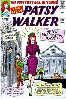 Following Patsy's high-school graduation in issue #116 (Aug. 1964), the title switched from humor to become a young career-gal romantic adventure.[23] Patsy Walker lasted through issue #124 (Dec. 1965),[24] with Patsy and Hedy outlasting it to its own #110 (Feb. 1967).[25]