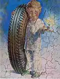 Fisk Tires used the now-updated version in ads to showcase its newly introduced "Air-Flights." That included thirteen times in The Saturday Evening Post, between Feb 8 and Aug 23, 1930 (latter pictured).[228][229] It was offered to the public as a colorful art print that could be framed.[230] The cheerful mascot appeared in many different formats. These were either with or without a facial touch-up (three signed variants are pictured).[231] It showed up on the front cover and endpapers of fairy tale or folktale books for children in 1931. As follows (8 total): Candy Land, Jack and the Bean Stalk, Little Black Sambo, Peter Rabbit, Pied Piper, Three Bears, Three Little Kittens, and Three Little Pigs.[232] They were generically subtitled Time to Re-tire / A Bedtime Story. It also appeared on ashtrays,[233] bridge score pads,[234] cigarette cases,[235] electrical clocks,[236] jigsaw puzzles (pictured),[237][238] matchbooks,[239] posters[240] and rubber heel replacements for shoes.[241] These were complimentary items for actual or potential customers (excluding the clocks).[242][243]
