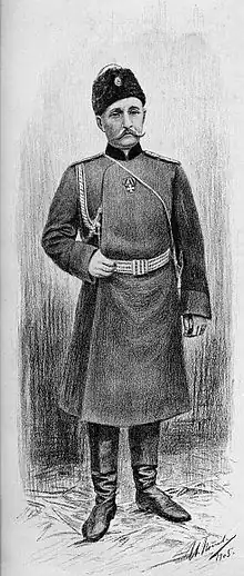 From 1903, Mischchenko was commander of the Trans-Baikal Cossack Brigade. During the Russo-Japanese War of 1904-1905 he commanded a separate East-Baikal Cossack Brigade, which was active in many of the battles of that war. Initially, his forces were in Korea, with instructions to obstruct the landing of the Japanese First Army and its march towards Manchuria. However, after several minor skirmishes, Mischchenko retreated across the Yalu River.[1] He played a minor role on the flanks of the Battle of the Yalu River,[2] and was also part of the Russian defenses at the Battle of Hsimucheng, and Battle of Te-li-Ssu. At the Battle of Liaoyang and at the Battle of Shaho, he commanded the Russian cavalry formations covering the rear guard of the Russian retreat.[1][3] He was promoted to lieutenant general in October 1904, and appointed commander of the new Cavalier Corps in December 1904 and led a major raid south on 6 January 1905 with 6000 horsemen on a mission to destroy Japanese supplies stockpiled at Niuzhuang. The mission was a disaster, and the force returned twelve days later with massive casualties.[1] He was wounded in the leg during the Battle of Sandepu and although reinstated as commander of the Cavalier Corps in March 1905, was not in the Battle of Mukden.