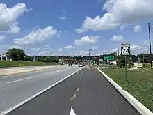 PA 74 fully enters West Manchester Township and becomes a four-lane divided highway, heading past businesses. The route widens to six lanes and comes to a diamond interchange with the US 30 freeway. Past this interchange, the road narrows to a four-lane divided highway, passing south of the West Manchester Town Center shopping center, before it becomes a two-lane undivided road that runs through wooded residential areas. PA 74 heads into the community of Shiloh, where it lined with a mix of homes and businesses. The route comes to an intersection with the western terminus of PA 238 before it crosses the Little Conewago Creek into Dover Township and heads west past residential and commercial development in the community of Weigelstown. The road curves northwest and passes through more suburban areas, entering the borough of Dover. Here, PA 74 becomes South Main Street and heads past homes and a few businesses, reaching a junction with the western terminus of PA 921. Past this intersection, the route becomes North Main Street and passes through more developed areas of the borough before it crosses back into Dover Township. PA 74 becomes Carlisle Road again and heads through farmland with some residential and commercial development. Farther northwest, the road runs through wooded areas with some homes as it bypasses the community of Mount Royal to the southwest.[2][3]