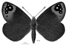 The wingspan of the Percnodaimon imago can be between 35 and 55 mm, and its broad velvety wings are usually black or brown across the dorsal surface, sometimes with a purple reflection. Forewings have characteristic black and white circles inside a patch of brown at their distal ends. There is little sexual dimorphism: males and females are similar in appearance, with females a little larger. The row of large pale spots often found on the underside of the hindwings is more noticeable in females.[5]