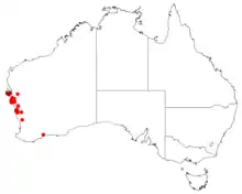 This persoonia grows in heath in near-coastal areas of Western Australia between Shark Bay and the Arrowsmith River in the Geraldton Sandplains and Yalgoo bioigeographic regions.[2][3]
