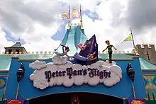 Peter Pan's Flight is a rail-suspended dark ride at the Magic Kingdom, Disneyland, Disneyland Paris, Tokyo Disneyland, and Shanghai Disneyland theme parks. Located in the Fantasyland area of each park, its story, music, staging, and artwork are based on Walt Disney's Peter Pan, the 1953 animated film version of the classic Peter Pan story by J. M. Barrie. It is also one of the few remaining attractions that was operational on Disneyland's opening day in 1955, although the original version was entirely redesigned in 1983.[3] Five of the six Disney resort destinations feature it, each with a unique exterior, walk-through queue and ride experience.