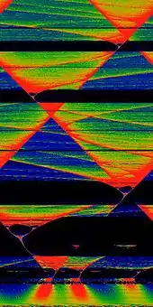 ![]() Circle map showing mode-locked regions or Arnold tongues in black. Ω varies from 0 to 1 along the x-axis, and K varies from 0 at the bottom to 4π at the top. The redder the color, the longer the recurrence time. |