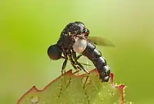 Philopotinae is a subfamily of small-headed flies. They have an arched body shape, as well as enlarged postpronotal lobes that form a collar behind the head. Their larvae are endoparasites of araneomorph spiders in the subgroup Entelegynae.[2]