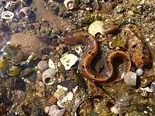 The rock gunnel may remain above the waterline at low tide, sheltered beneath rocks and algae, and can breathe air if necessary.[6] They are frequently encountered on rocky shorelines, and splash around noticeably when uncovered. Within its North American range, the rock gunnel disappears from the intertidal during winter, likely to avoid freezing air temperatures.[7] Their diet is made up of small crustaceans, polychaetes, mollusks and the eggs of fish. The female lays the eggs in a large mass on the seabed and this is closely guarded until the larvae hatch. The butterfish spawns from November to January, the female laying between 80 and 200 eggs in a ball-like mass placed beneath a stone or in the empty shell of a bivalve.[1]