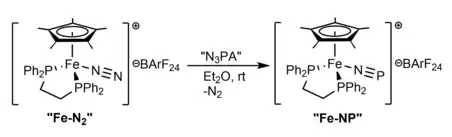 Cummins and co-workers exploited their N3PA free PN releasing reagent to "trap" and isolate a stable terminal (dppe)(Cp*)Fe-NP complex as a BArF24 salt. The NP bond length in this case was very short at 1.493(2) Å, almost unperturbed from gaseous PN, which is consistent with minimal pi-backbonding from the iron center. Studies confirmed the NP binding mode (as opposed to PN) to be energetically preferred by 36.6 kcal/mol (153 kJ/mol) in this iron complex, creating a significant barrier to isomerization (thought to arise from Pauli repulsion effects).[42] Studies of phosphorus mononitride chemistry at tris(amido) vanadium complexes undertaken by Cummins and coworkers provides the bulk of PN reactivity examples at transition metals to date. In this system, PN is synthetically generated at a vanadium center from respective dibenzo-7λ3 -phosphanorbornadiene derivative precursors. However, it is not stable as a terminal ligand, and instead immediately undergoes trimerization. Notably, a thermodynamic equilibrium exists between this trimer species, along with a dimer and non-observed monomeric intermediate fragment.[4][50]