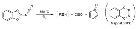 In 2023, Qian et al. proposed PN to be generated as a major product along with CO and cyclopentadienone byproducts when (o-phenyldioxyl)phosphinoazide is heated to 850 °C (following the loss of N2). However, efforts to observe free PN in argon matrixes using this method were unsuccessful due to band overlaps.[2]