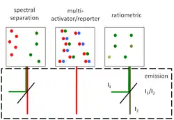 The peculiar photophysical properties of the fluorophores employed in PALM/STORM super resolution imaging pose both constraints and opportunities for multicolor imaging. Three strategies have emerged so far: excitation of spectrally separated fluorophores using an emission beamsplitter,[12] using of multiple activators/reporters in STORM mode[13][14] and ratiometric imaging of spectrally close fluorophores.[15]