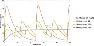 Simulated drug plasma concentration over time curves following IV infusion and multiple oral doses. The drug has an elimination half-life of 4 hours, and an apparent volume of distribution of 10 liters.