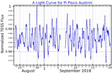As of 2023, there appears to be no consensus in the astronomical literature about whether or not Pi Piscis Austrini is a variable star, and if it is variable, what type of variable star it is. In 1965 it was designated a classical Cepheid variable star with a visual (V) band brightness that varied by 0.3 magnitudes over a period of 7.975 days.[10] The AAVSO's International Variable Star index lists it as a Gamma Doradus variable, with a V band magnitude range of 5.10 to 5.12.[11] Axel Thomas, writing in the AAVSO's Journal, reports that the star appears to be a semiregular variable star, varying by 0.7 magnitudes in V band over a period of 8.625 days.[12] Koen and Eyer examined the Hipparcos data for the star, and report it to be a microvariable with a period of 1.06039 days.[13] On the other hand, the General Catalog of Variable Stars reports the star's brightness as constant,[14] and in separate studies Michel Petit[15] and E. Janot-Pacheco could not detect any change in brightness.[10]
