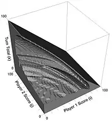 Optimal play for 2-player Pig was computed by Todd W. Neller[5] and visualized by Clifton G. M. Presser in 2001.[6] At any time, the relevant decision information includes the player's score, the opponent's score, and the turn total. Such information corresponds to a 3D point in the graph's space. If this point is inside the gray solid, the player should roll. Otherwise, the player should hold.