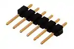 A pin header (or simply header) is a form of electrical connector. A male pin header consists of one or more rows of metal pins molded into a plastic base, often 2.54 mm (0.1 in) apart, though available in many spacings.[1] Male pin headers are cost-effective due to their simplicity. The female counterparts are sometimes known as female socket headers, though there are numerous naming variations of male and female connectors. Historically, headers have sometimes been called "Berg connectors"[2] or "DuPont" connectors, but headers are manufactured by many companies.[3]
