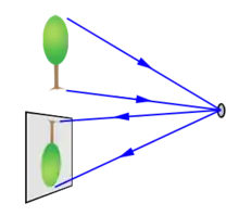 Principle of a pinhead camera. Light rays from the object reflect off a small mirror and are projected as an image.