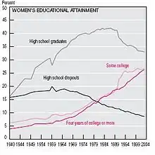 Women entering the workforce had difficulty finding a satisfactory job without references or an education.[42] However, opportunities for higher education expanded as women were admitted to all-male schools like the United States service academies and Ivy League strongholds.[43] Education became a way for society to shape women into its ideal housewife. In the 1950s, authorities and educators encouraged college because they found new value in vocational training for domesticity.[44] College prepared women for future roles because while men and women were taught together, they were groomed for different paths after they graduated.[45] Education started out as a way to teach women how to be a good wife, but education also allowed women to broaden their minds.