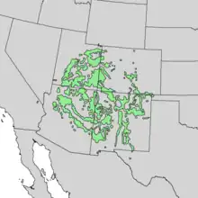 The range in the U.S. is in Colorado, southern Wyoming, eastern and central Utah, northern Arizona, New Mexico, western Oklahoma, southeastern California, and the Guadalupe Mountains in far western Texas, as well as northern Mexico.[5] It occurs at moderate elevations of 1,600–2,400 metres (5,200–7,900 ft), rarely as low as 1,400 m (4,600 ft) and as high as 3,000 m (9,800 ft). It is widespread and often abundant in this region, forming extensive open woodlands, usually mixed with junipers in the pinyon-juniper woodland plant community. The Colorado pinyon (piñon) grows as the dominant species on 4.8 million acres (19,000 km2 or 7,300 sq mi) in Colorado, making up 22% of the state's forests. The Colorado pinyon has cultural meaning to agriculture, as strong piñon wood "plow heads" were used to break soil for crop planting at the state's earliest known agricultural settlements.