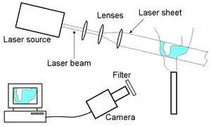 A PLIF setup consists of a source of light (usually a laser), an arrangement of lenses to form a sheet, fluorescent medium, collection optics and a detector. The light from the source, illuminates the medium, which then fluoresces. This signal is captured by the detector and can be related to the various properties of the medium.