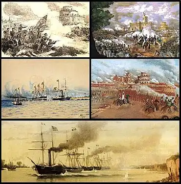 From top to bottom: Brazilian 1st Division in the Battle of Caseros; Uruguayan infantry aiding Entre Ríos cavalry in Caseros; Beginning of the Battle of the Tonelero Pass; Charge of Urquiza's cavalry in Caseros; Passage of Brazilian fleet at the Tonelero.