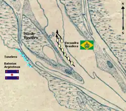 Location of the Imperial Armada passing through Tonelero and Argentine batteries.
