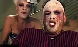 Pink is then shown in the kitchen preparing a salad, rapidly and angrily chopping the vegetables with a large knife. Her boyfriend awakens in bed, and attempts to sneak out through the door, but Pink catches him at the doorway. She gives him a bewildered look while holding the bowl of salad, as he debates whether or not he can escape. He opens the door, only to be instantly attacked by one of Pink's dogs. He is next shown opening his eyes to Pink's face yet again, as she paints his face with clownish makeup, while he sits in a wheelchair. She is wearing another lavish outfit. His hands are tied, and he is bruised and battered almost beyond recognition. Pink grabs his wheelchair, spins it around a few times and pushes it off a high step, seeming to enjoy herself in the process. He flies out of the chair, into a room filled with carnival themed objects such as horses used in a merry go round and various dolls. Pink lies on top of him, acting completely innocent, and kissing his cheek.