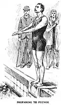 According to the 1920 Official Swimming Guide of the American Swimming Association, the plunge for distance "is a dive from a stationary take-off which is free from spring from a height of 18 inches above the water. Upon reaching the water the plunger glides face downward for a period of 60 seconds without imparting any propulsion to the body from the arms and legs." To determine the total distance traveled, the measurement was taken from the farthest part of the body from the start, "opposite a point at right angles to the base line."[2] Generally, being fat was an advantage in the sport.[3] The 60-second limitation appears to have been instituted at the English Plunging Championship around 1893.[4]