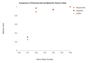 A comparison of the relative fissiogenic xenon yields found in the meteorites Pasamonte and Kapoeta with those of a laboratory sample of plutonium-244.[7]