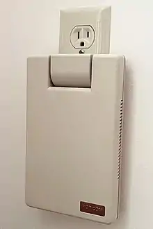 The X100—the flagship product in the Popcom range—is an external modem, housed in a beige[4] plastic case with a built-in AC power adapter.[5] Its two-pronged (non-polarized) plug is molded into a swiveled hinge, allowing it to hug the wall when the modem is plugged directly into a wall socket (the prongs perpendicular to the socket and the rest of the unit parallel) or be plugged into a power strip (the entire unit perpendicular to the strip).[6] The three communications ports of the X100 include the RS-232 serial port (a female DB-25 connector), a modular 6P6C port for telephone handsets, and a modular 8P8C port that connects the X100 to the wall phone jack. The communications ports are located opposite the AC plug, or at the base of the modem when the modem is plugged into the wall.[7] The X100 measures 7.8 by 4.7 by 1.6 inches (19.8 by 11.9 by 4.1 cm)—not including the plug, which contributes to 0.7 in to either the length or depth, depending on the direction it faces.[7] The plug cannot fold down into the unit.[8] A dimple in what is normally the rear of the unit contains a radial potentiometer in its center, which adjusts the volume of the modem's internal speaker. When the X100 is plugged into a wall socket, the speaker faces flush to the wall, so ventilation slots are included to let sound out through the sides of the unit.[4]
